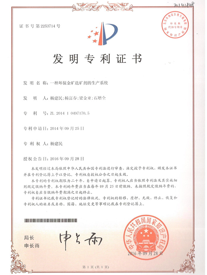 熱烈祝賀我公司又取得一項(xiàng)專利《一種環(huán)保金礦選礦劑的生產(chǎn)系統(tǒng)》
